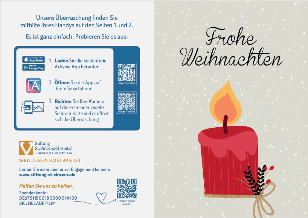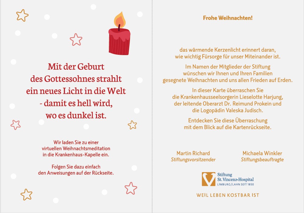 Mit einer Weihnachtskarte der ganz besonderen Art grüßen die Limburger Klinikseelsorge gemeinsam mit der Stiftung St. Vincenz-Hospital Limburg alle Mitarbeitenden und Patient:innen, die an Heilig Abend im Krankenhaus sind.