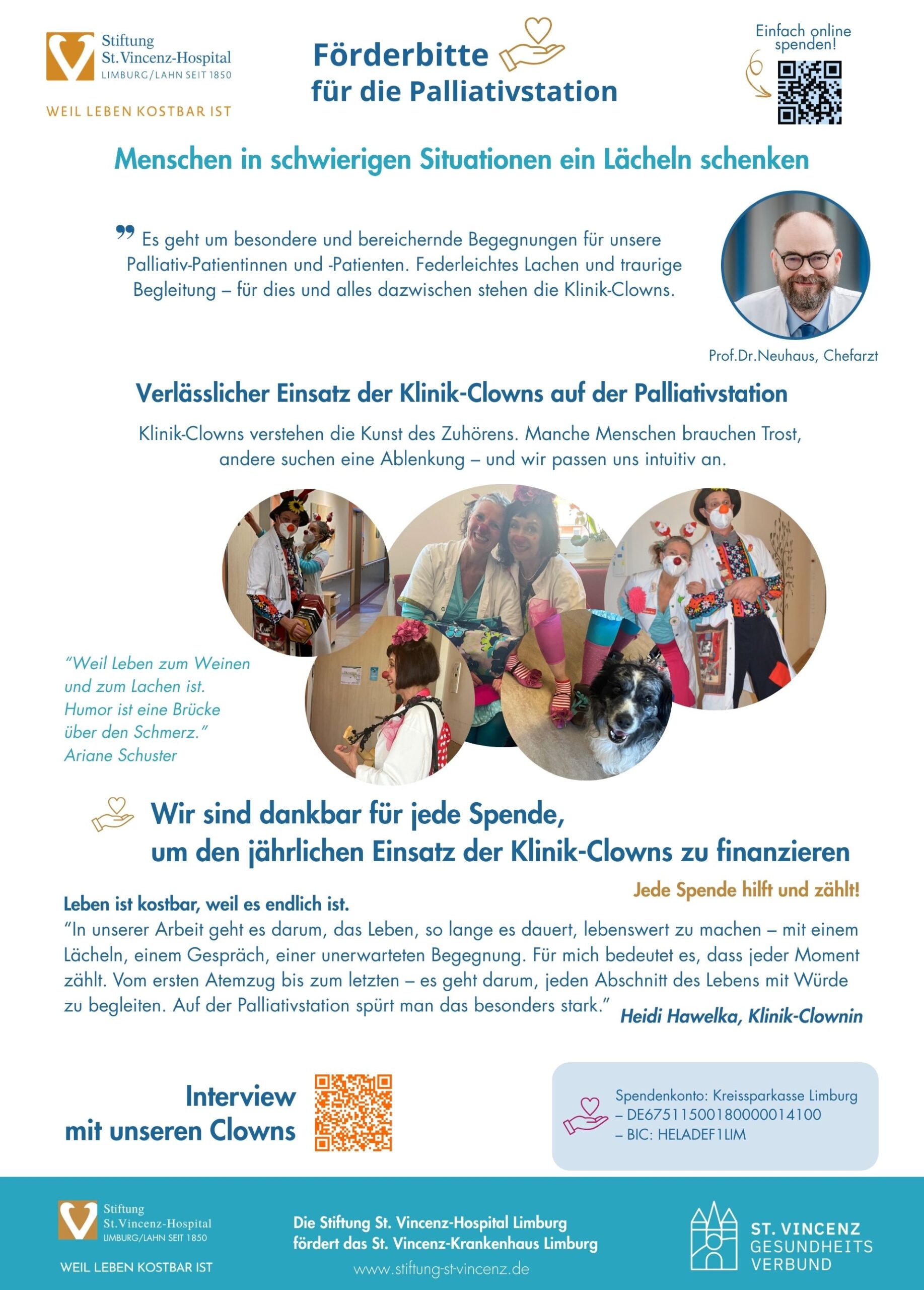 Für die Patienten bedeutet dieses „bisschen mehr an Lebensqualität” so unsäglich viel, dass jeder, der dies miterlebt, zutiefst berührt ist. Die Vincenz-Stiftung unterstützt das Team auf der Palliativstation bei seiner schweren Aufgabe und fördert das zusätzliche Angebot der „Klinik-Clowns“.